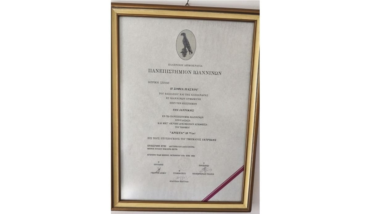 2002: Πτυχίο Ιατρικής του Πανεπιστημίου Ιωαννίνων με βαθμό 8,5 «ΑΡΙΣΤΑ»